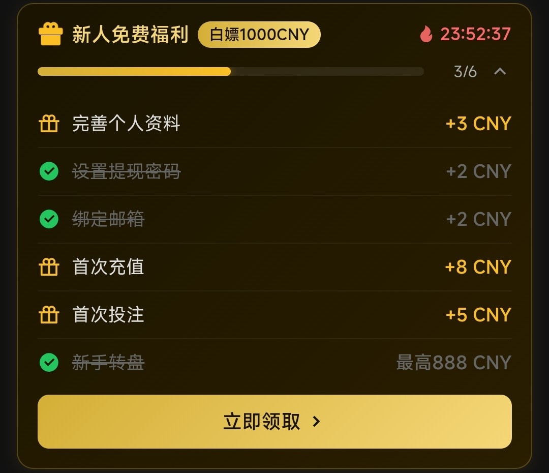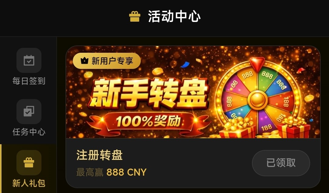 注册好后会有一个转盘弹窗出来,点击转动即可,优惠里有签到彩金跟新手任务彩金