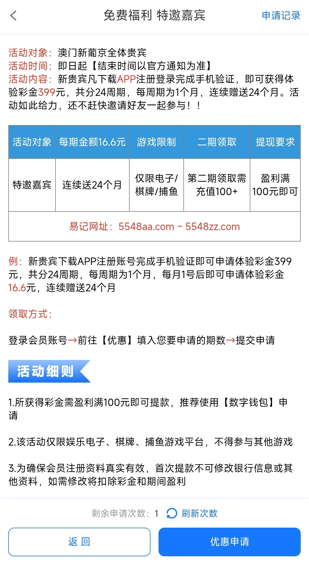 下载APP注册登入完成手机号验证到优惠里申请彩金,彩金审核会有点久,盈利满100出款,仅限:电子/棋牌/捕鱼